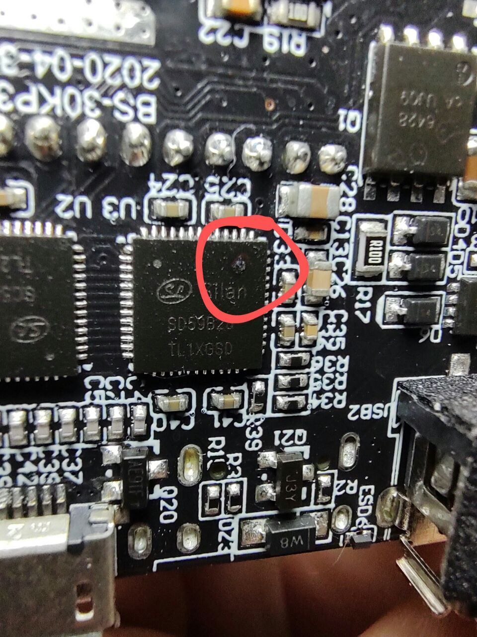 Гугл по номеру SD59B23 показал, что это довольно типовая распространенная проблема этих банок, именно 65W на 30000mah, связанная, вероятнее всего с перегревом чипа. На охлад там стоит радиатор с толстенной термопрокладкой, чип мелкий, потому, в принципе похоже на правду, учитывая, что все остальное на плате вроде как живое.