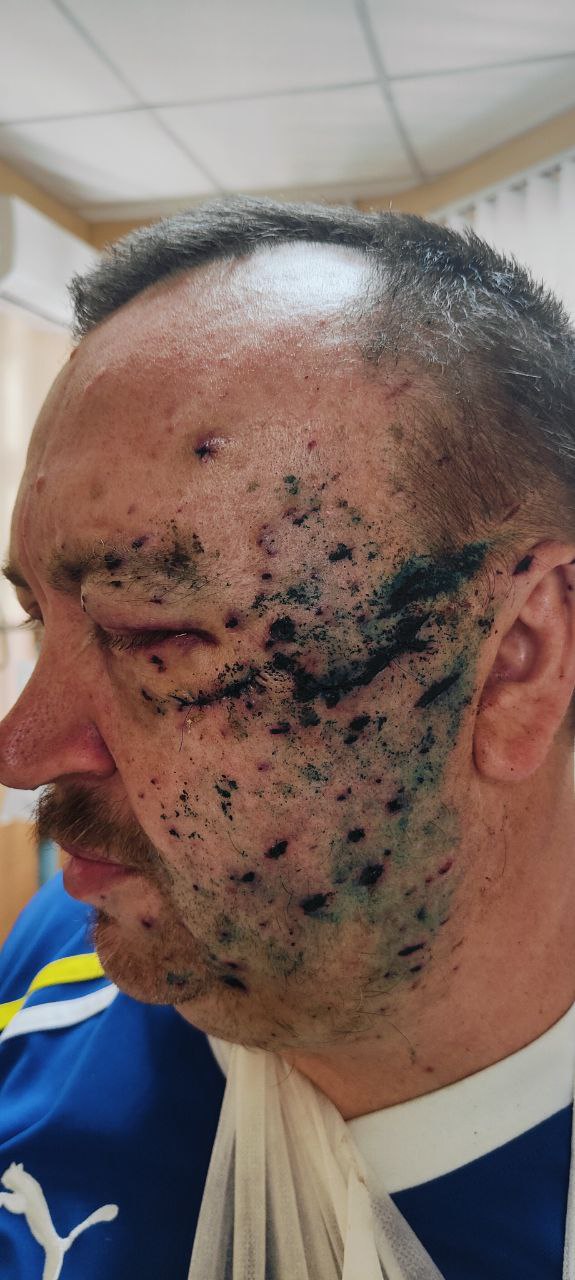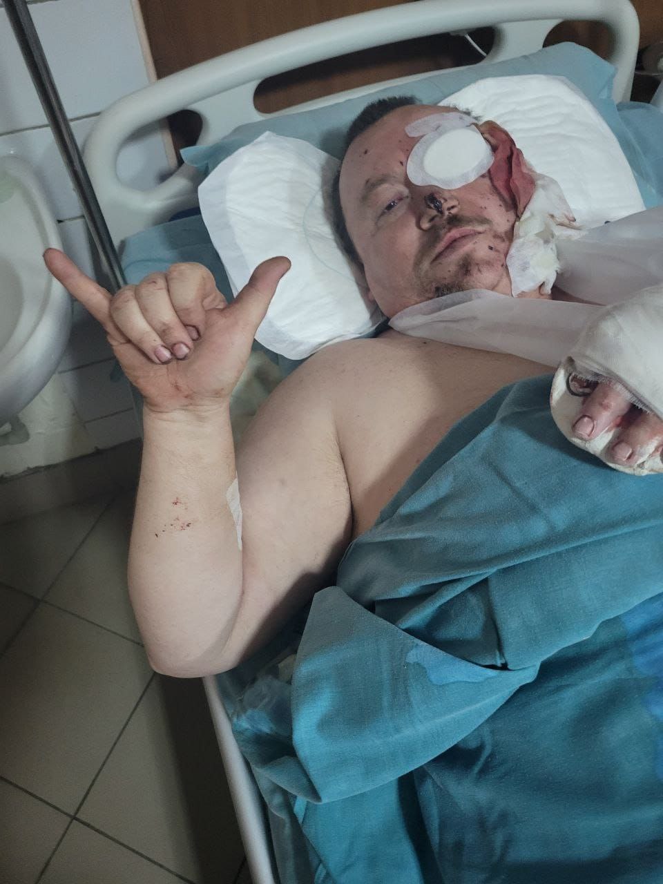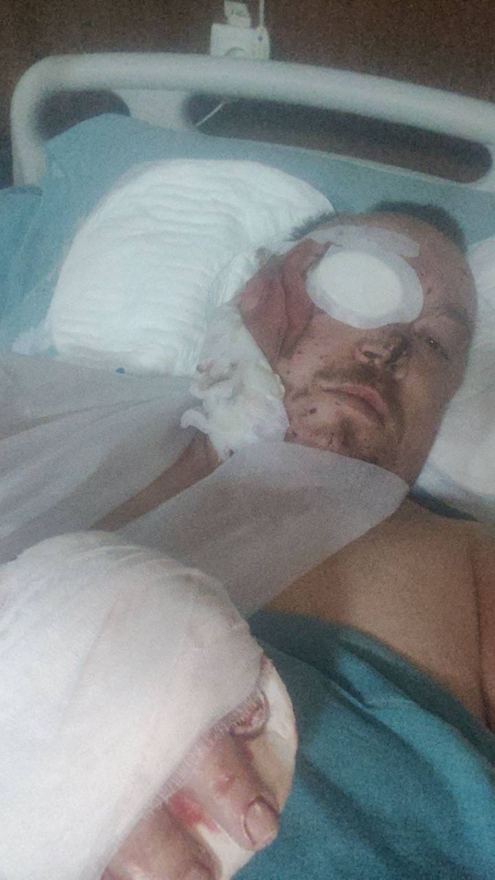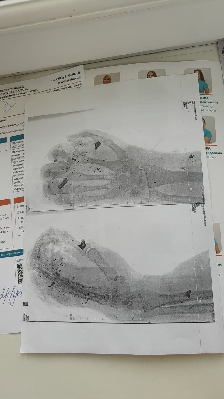 В оці множенні проникні скалки. Операцію на оці зробили, великі залізяки прибрали. Малі ще лишилися. 2 місяці будуть загоюватись рани, потім повторні операції по руці і установка кришталика.