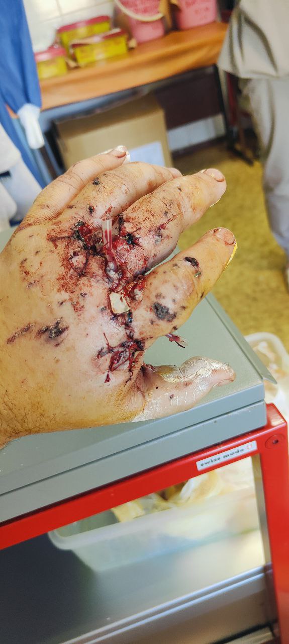 Розбита кисть лівої руки. Був майже ампутований вказівний палець. Відсутній суглоб вказівного пальця.
